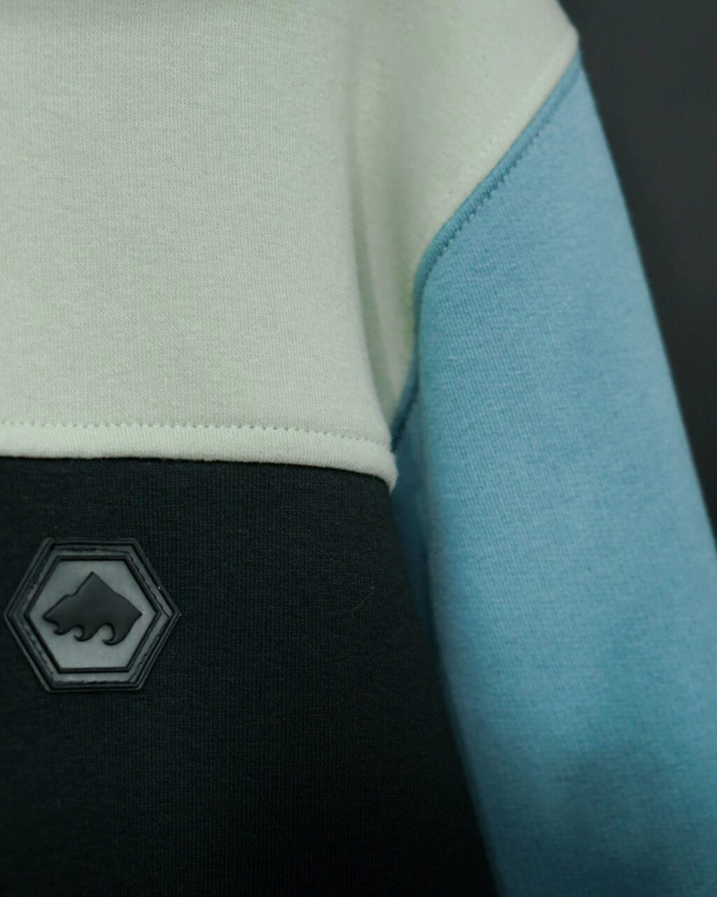 Diseño: corte oversize, con etiqueta hexagonal de goma en el pecho. Grifa bordada en puño derecho.